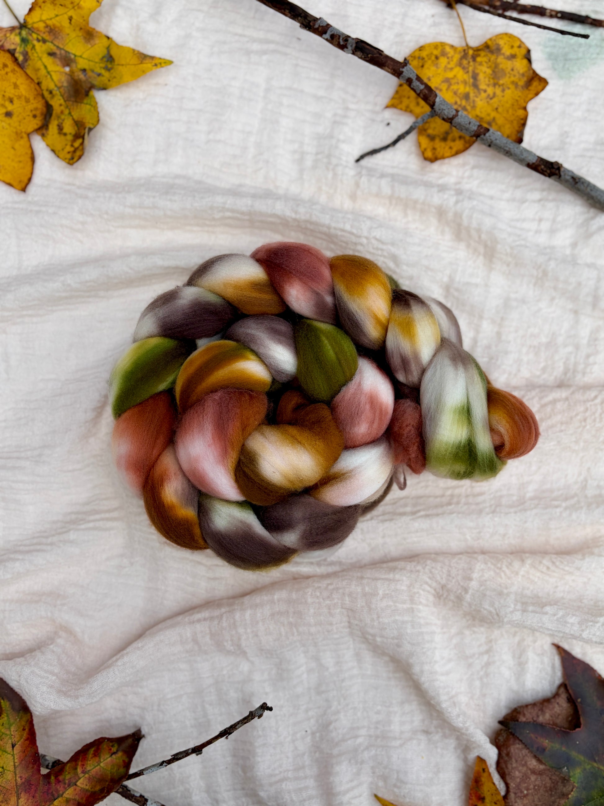 ♡ Alone Together: This variegated colorway has layers of swampy green, light maroon, golden orange, rich browns, and spots of taupe that collectively create a beautiful array of colors peaking throughout each strand.