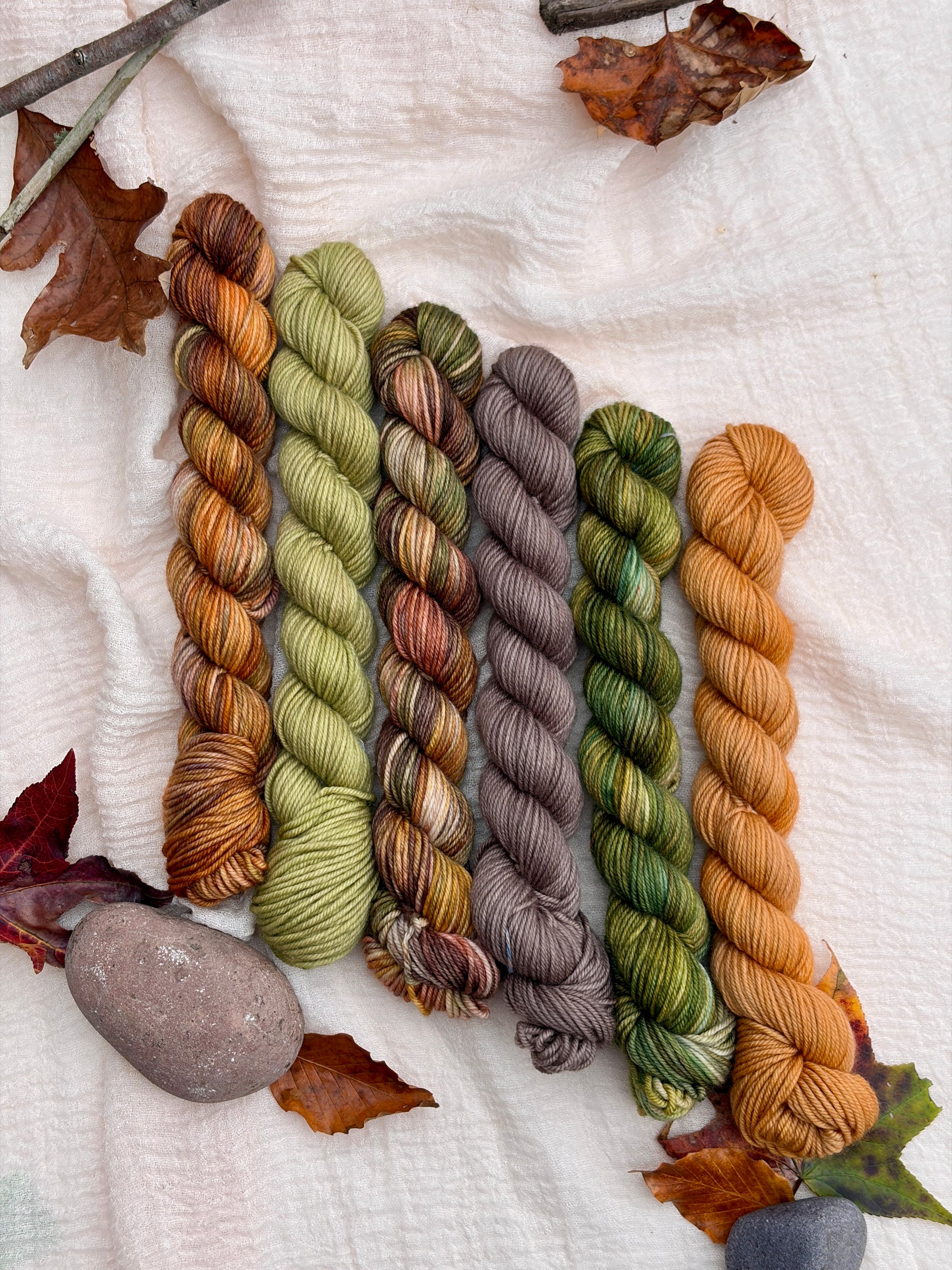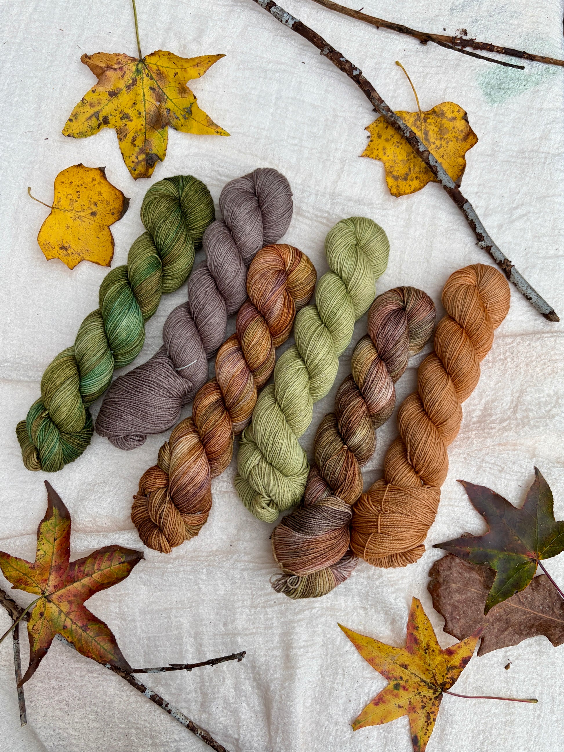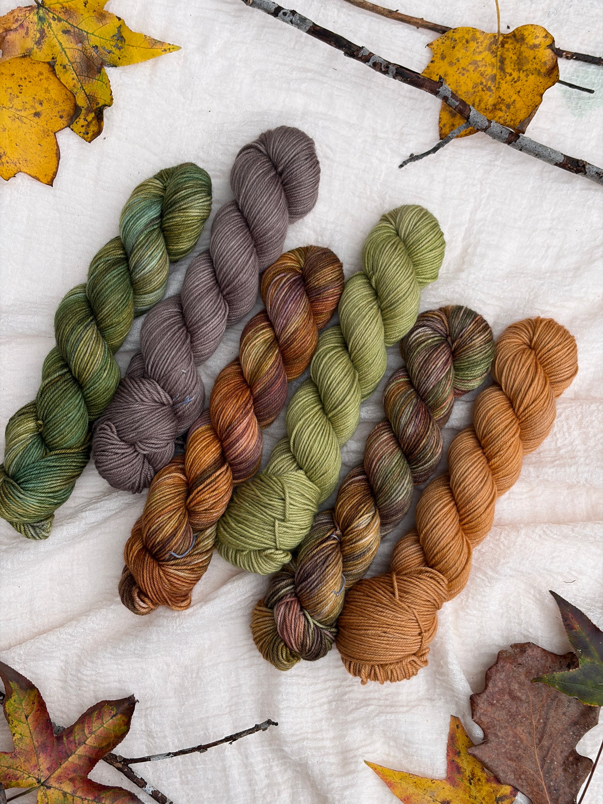 ♡ Alone Together: This variegated colorway has layers of swampy green, light maroon, golden orange, rich browns, and spots of taupe that collectively create a beautiful array of colors peaking throughout each strand.
