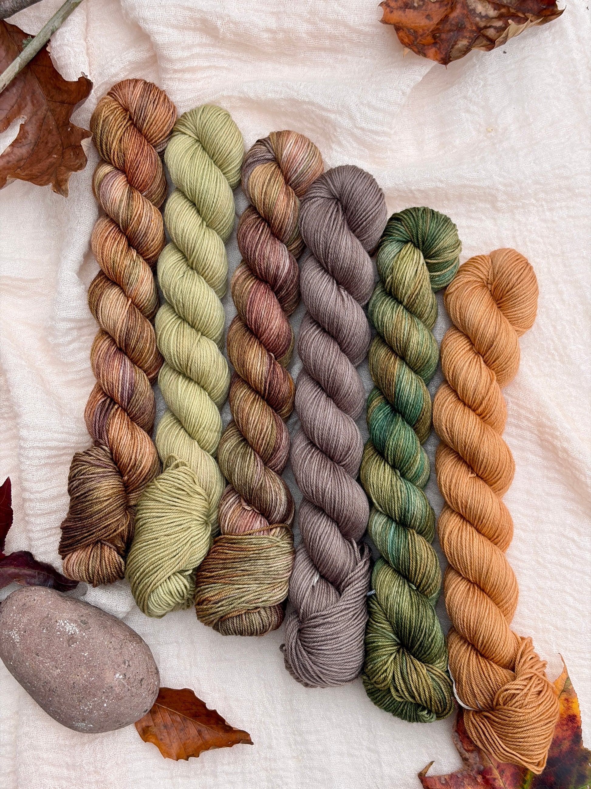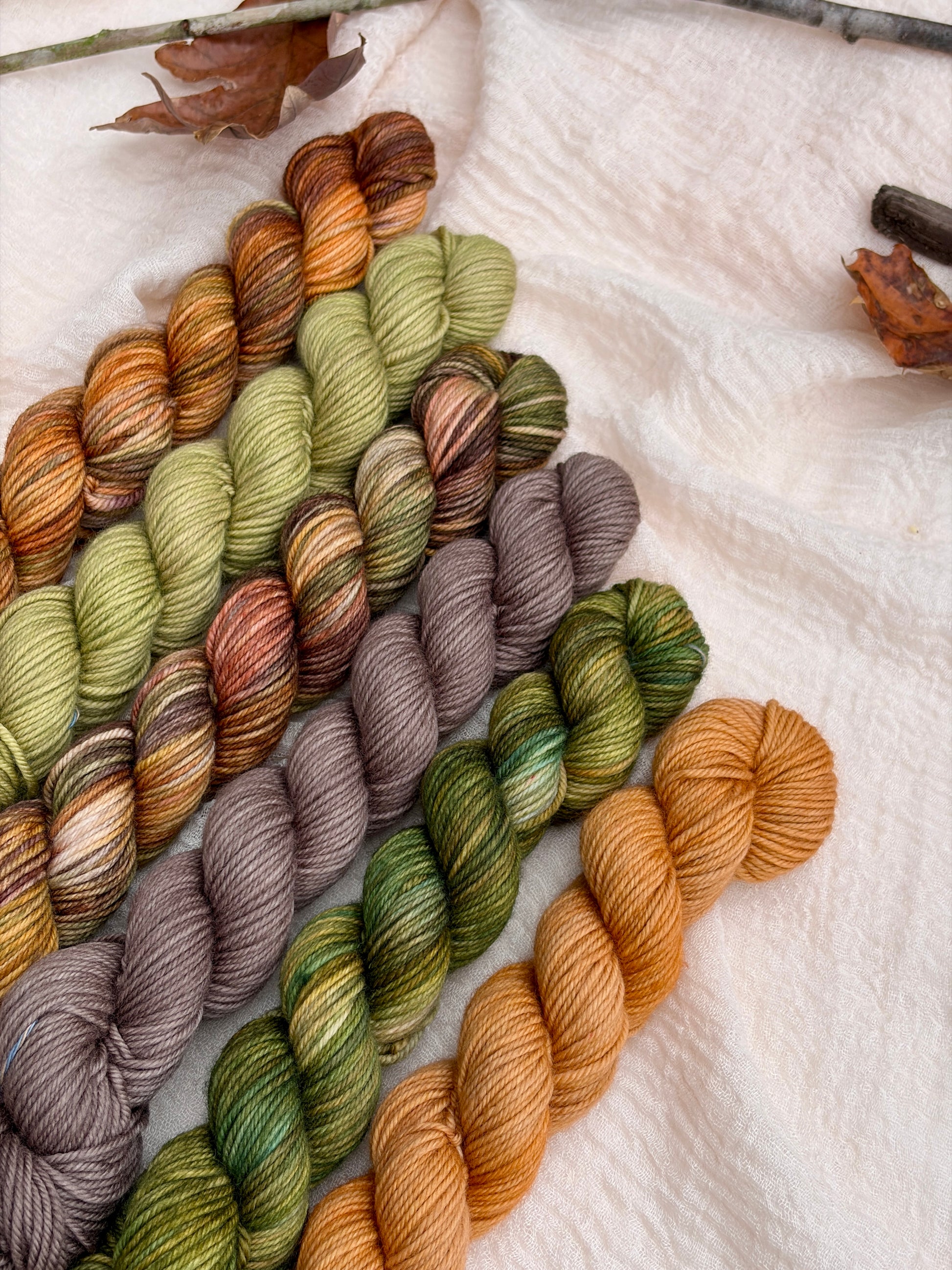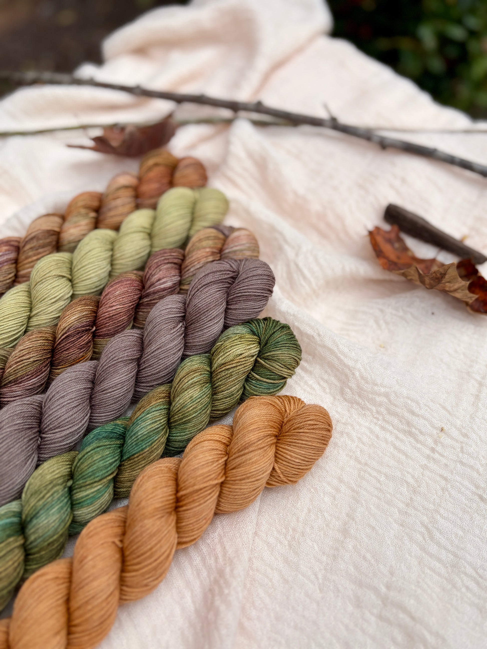 ♡ Alone Together: This variegated colorway has layers of swampy green, light maroon, golden orange, rich browns, and spots of taupe that collectively create a beautiful array of colors peaking throughout each strand.